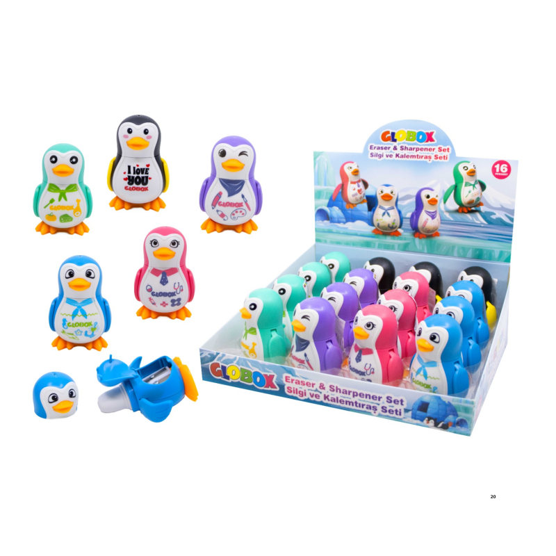 GLOBOX 3819 SİLGİ VE KALEMTRAŞ SETİ 16'LI(PENGUEN)